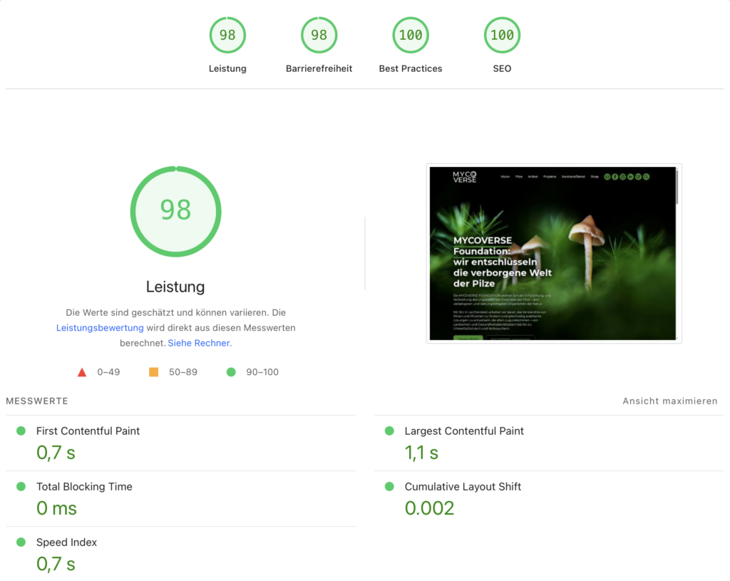 Und wie bei jeder Website ist die Performance (also die Schnelligkeit, mit der die Seite aufgerufen werden kann) außerordentlich wichtig. Klar: niemand will lange auf das Laden der Website warten. Hier haben wir außerordentlich gute Ergebnisse erreicht: